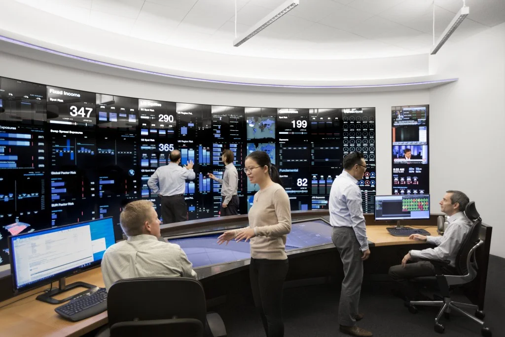 The Sole-trade Risk Management Center provides a comprehensive, real-time view of all investment portfolios. Built in 2014, its systems connect globally, continuously running operational readiness, risk, and stress test monitors to visualize data for rapid comprehension.